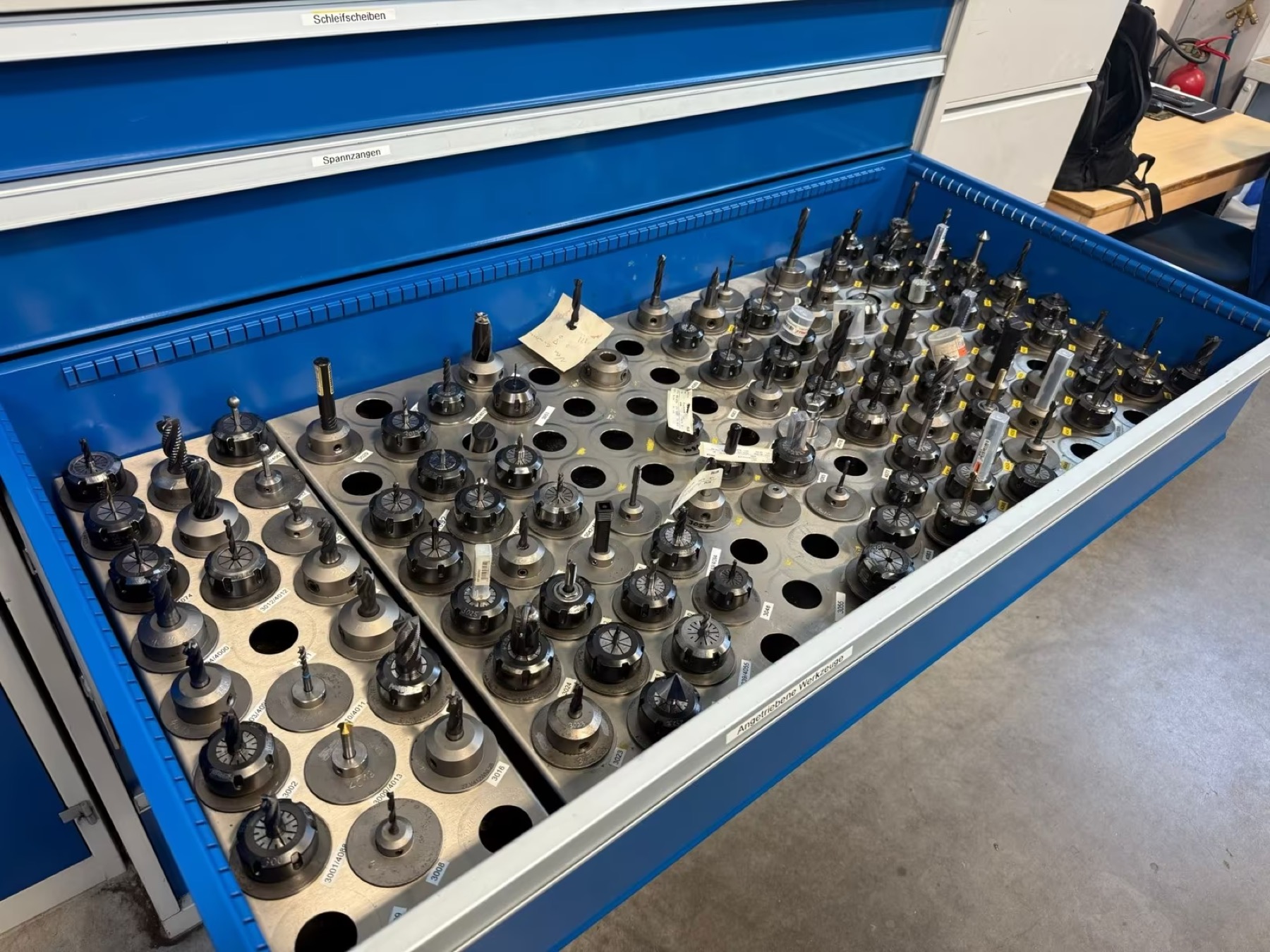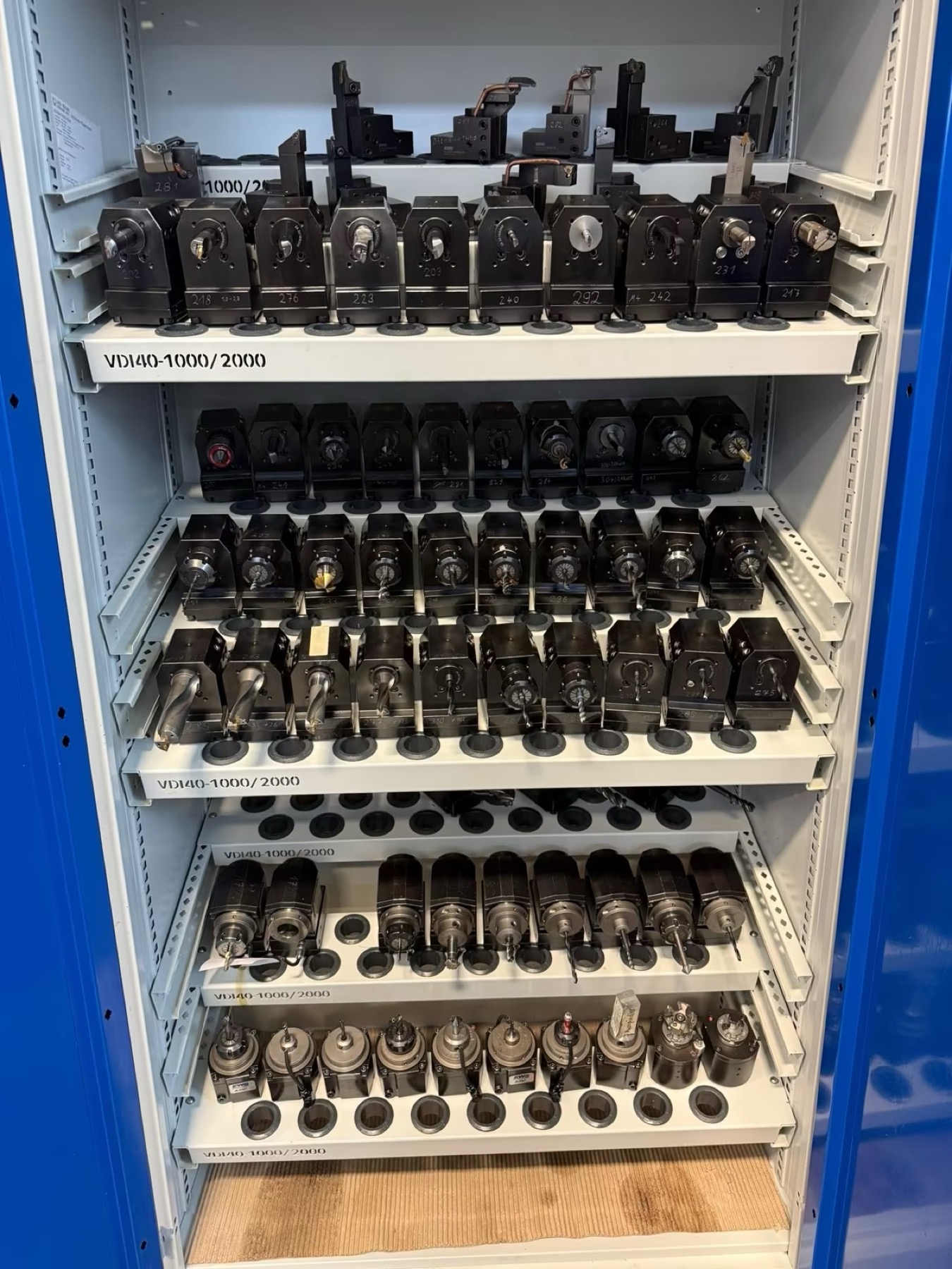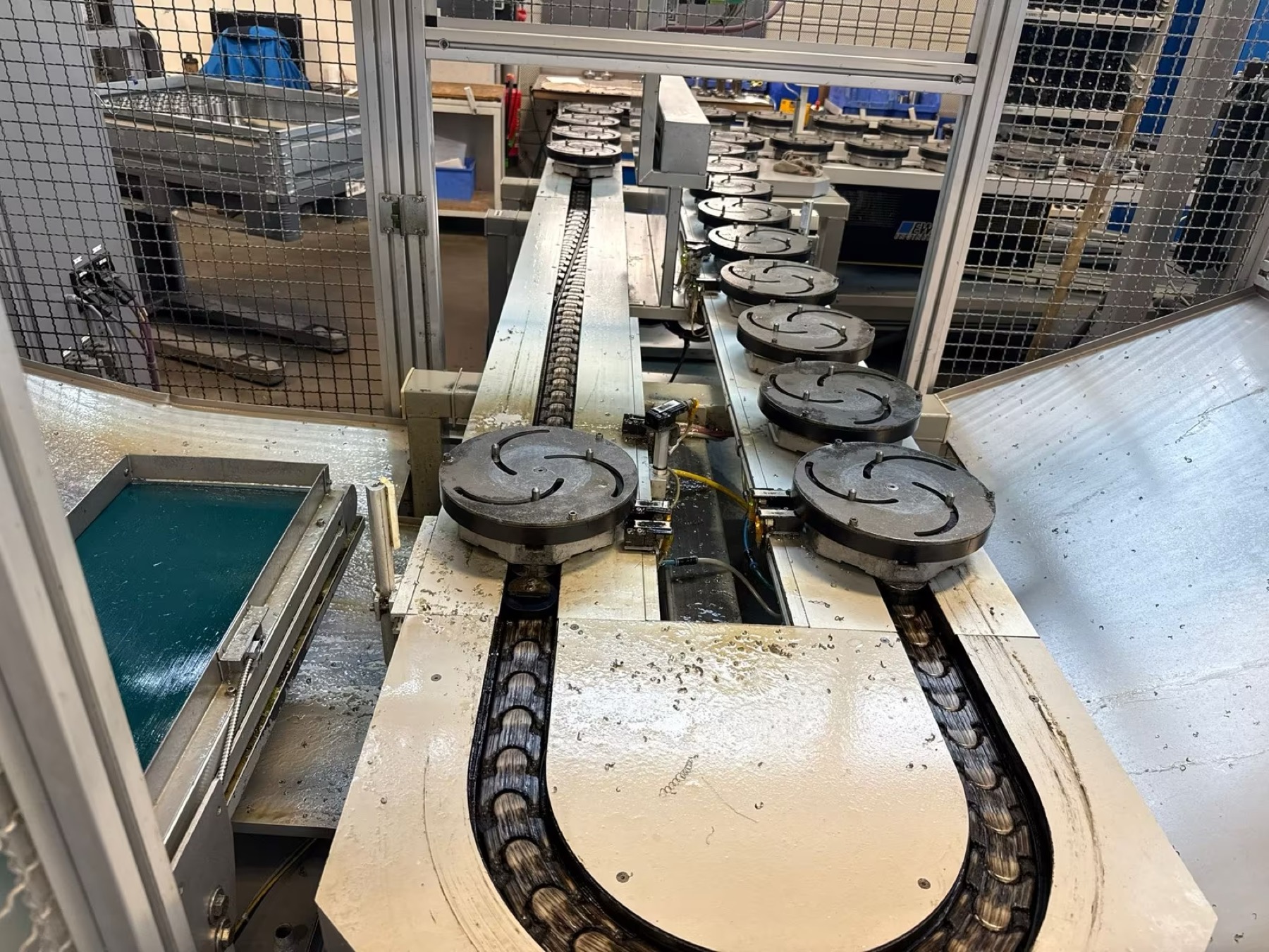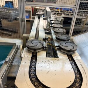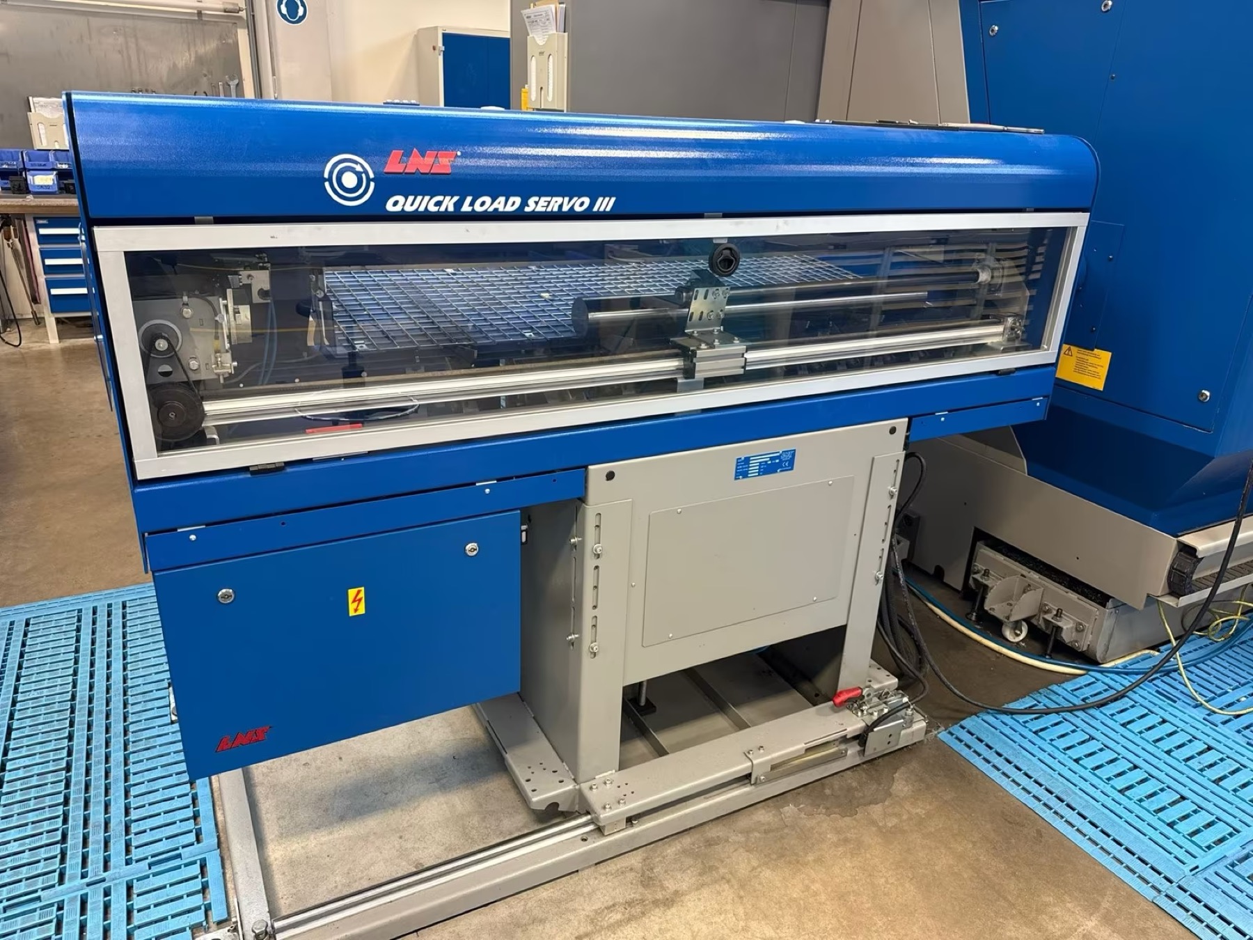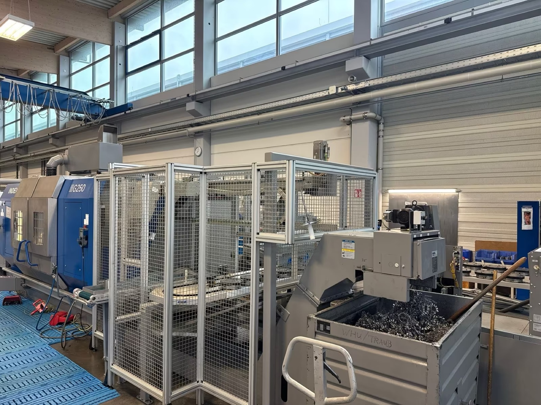 Das CNC-Drehzentrum INDEX G250 wird angeboten inklusive des Stangenvorschubgeräts LNS Quickload Servo 3, des EWAB PS-800 Werkzeugträgersystems, des KNOLL S 400-1/490 Späneförderers, der Knoll FKA 750 Kühlmittelvorrichtung sowie einer Luftreinigungsanlage.